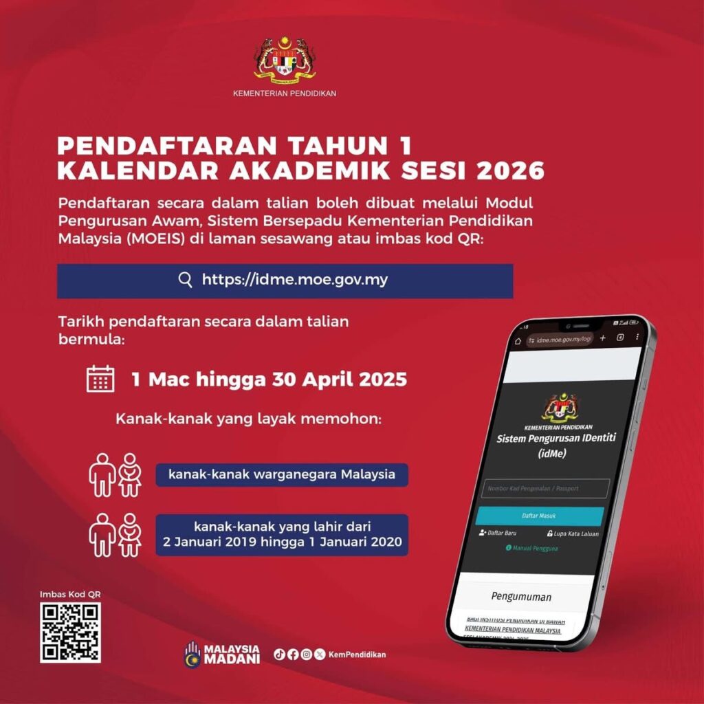 Bagi ibu bapa yang mempunyai anak yang bakal memasuki Tahun 1 pada sesi akademik 2026, pendaftaran kini boleh dilakukan secara dalam talian melalui Sistem Bersepadu Kementerian Pendidikan Malaysia (MOEIS).